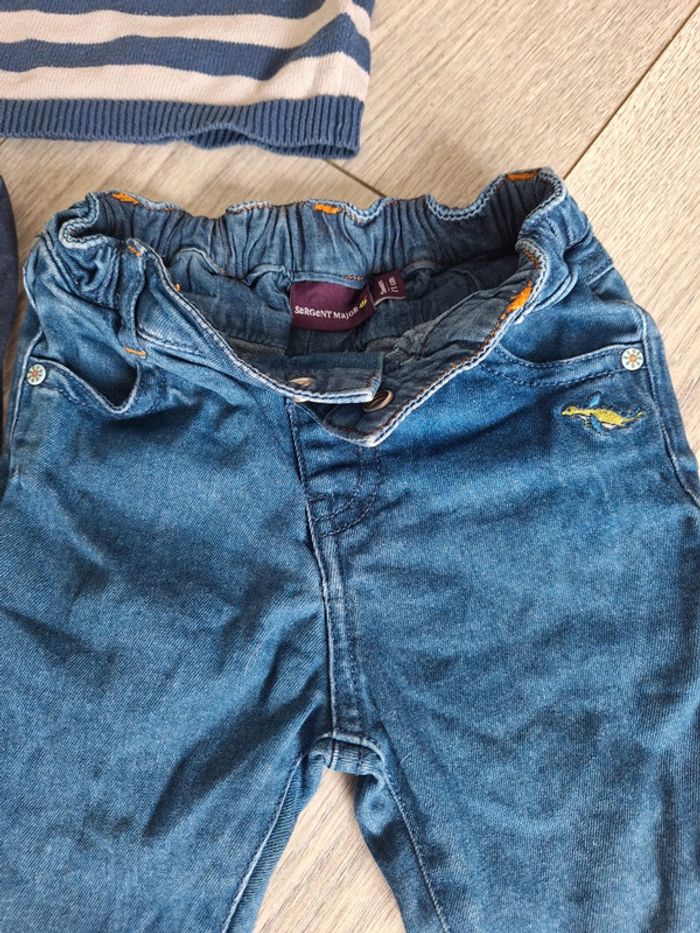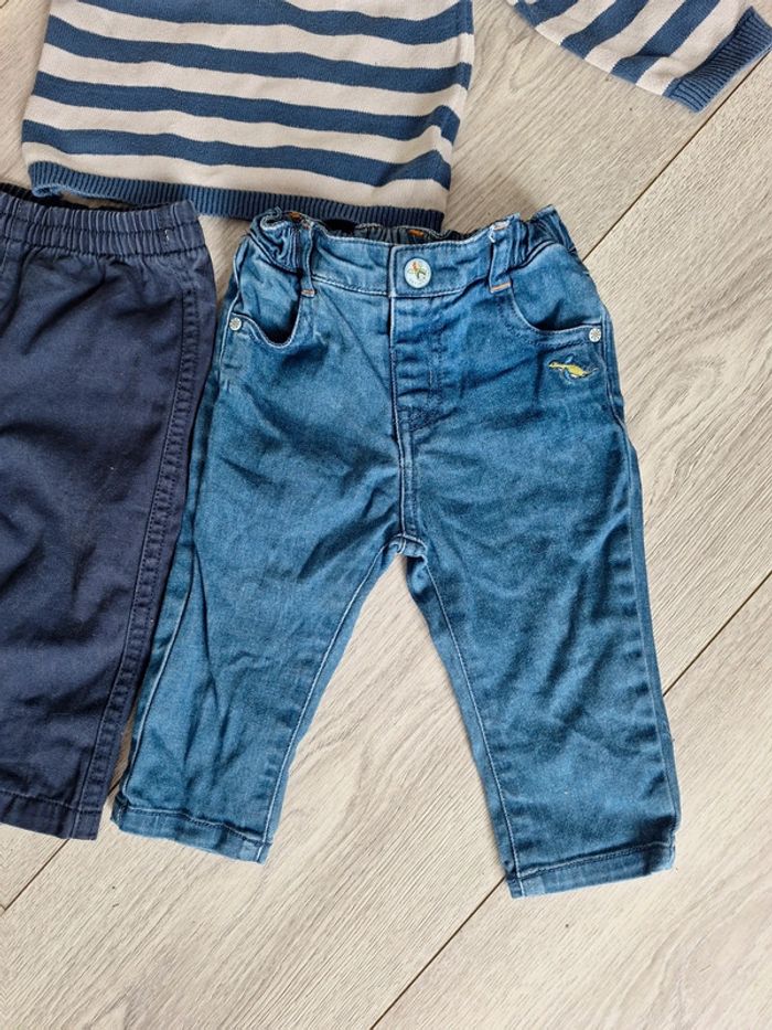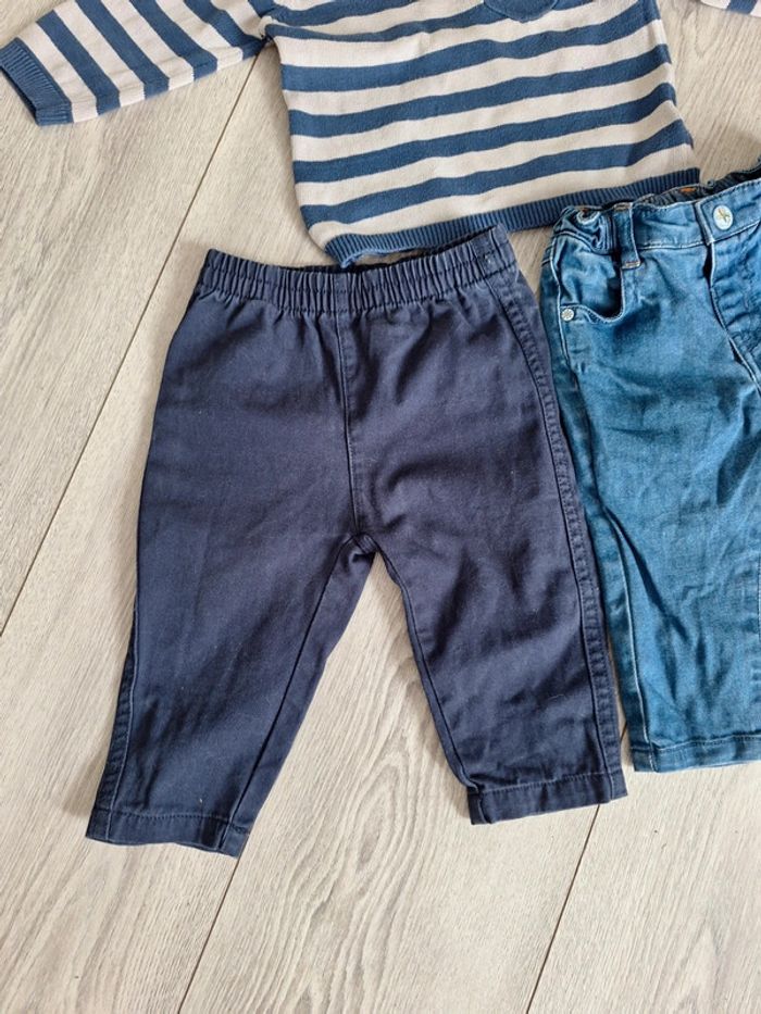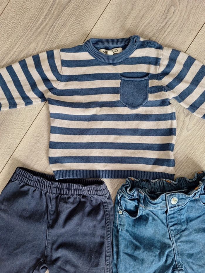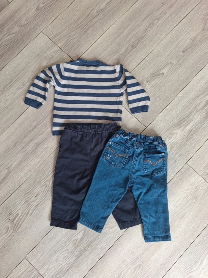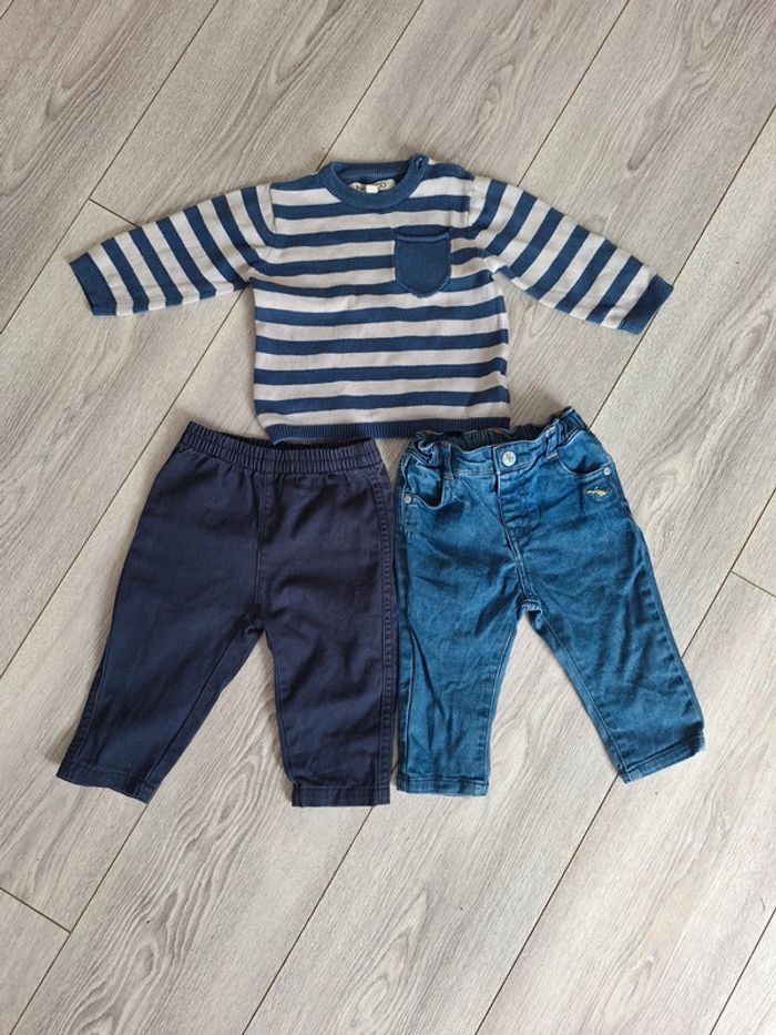 Lot d'un pull 9 mois à rayures, manches longues, boutons sur l'épaule NewCo Un jean 9 mois Sergent Major excellent état un pantalon en toile bleu marine 12 mois 100 % coton sans marque Le tout en très bon état