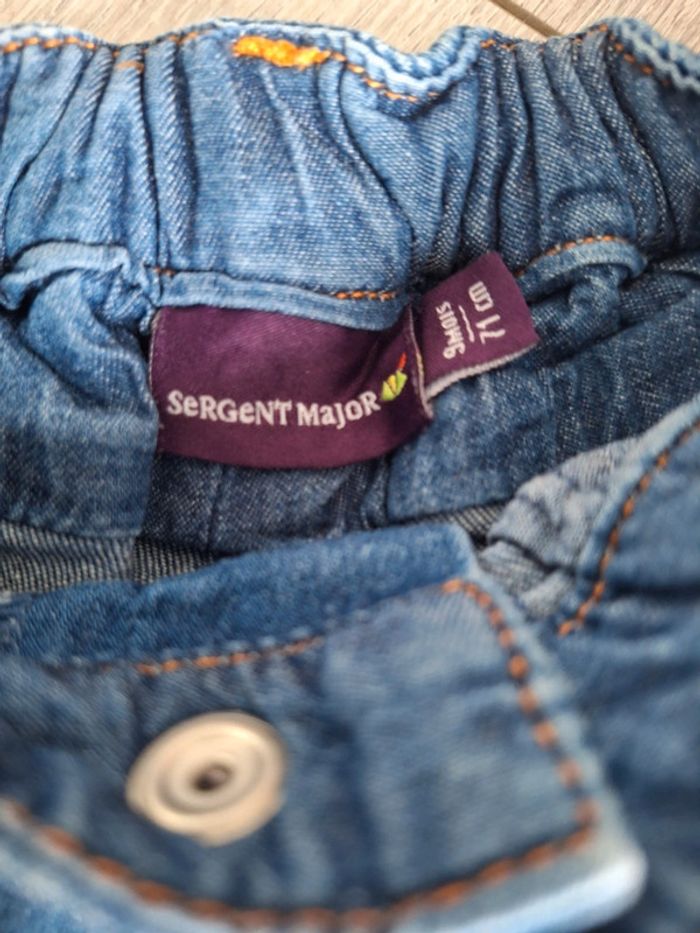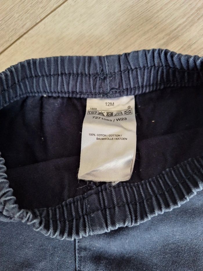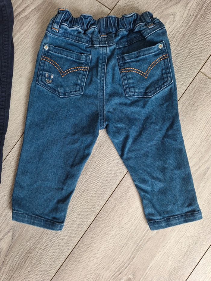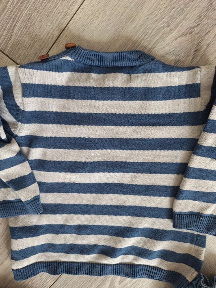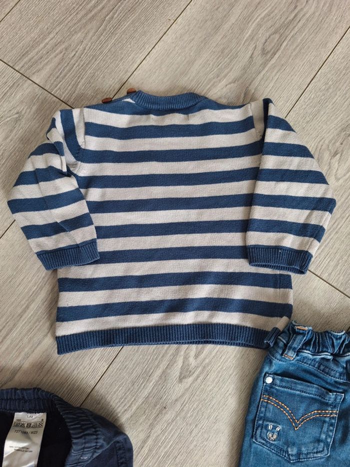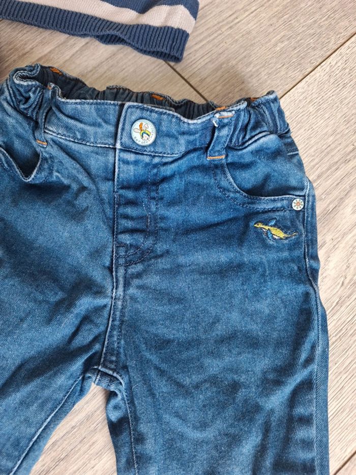 Lot d'un pull 9 mois à rayures, manches longues, boutons sur l'épaule NewCo Un jean 9 mois Sergent Major excellent état un pantalon en toile bleu marine 12 mois 100 % coton sans marque Le tout en très bon état