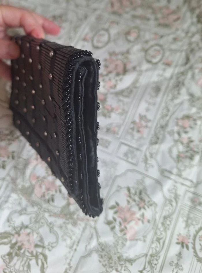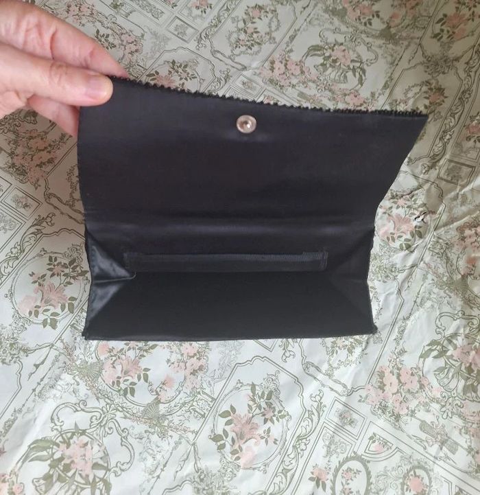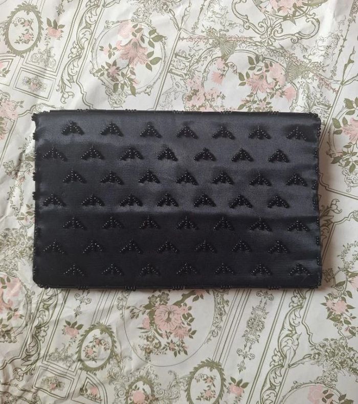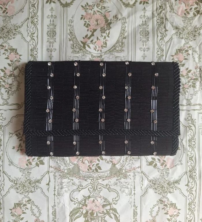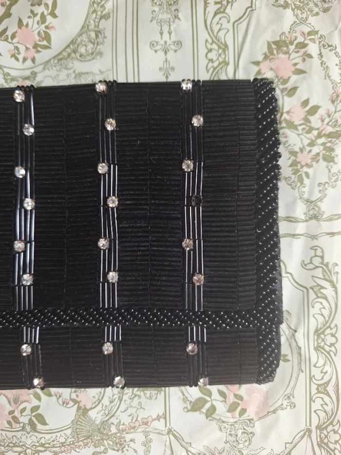 Belle pochette noire comme neuve mais j'ai fait tombé une petite perle brillante voir photo Le reste est en excellent état, elle a même une pochette à l'intérieur Largeur 19 cm Hauteur fermé par une pression 12 cm Profondeur 2 cm Avec petites motifs noir au dos