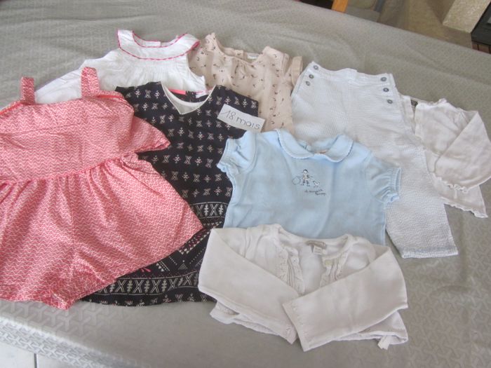 18 mois, gilet + pantalon + haut mc + 3 robes + combi short + gilet court offert (couleur passée), obaibi, tao, gemo, grain de blé