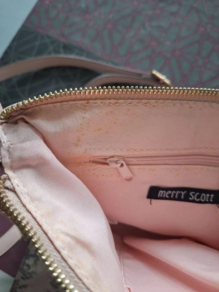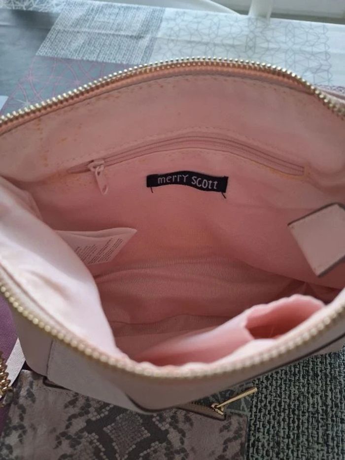 Très beau sac à main, bandoulière réglable avec porte-monnaie de 16 x 13 cm, assorti, en très bon état Simili rose poudrée, pochette en daim sur le devant Pochette avec fermeture éclair à l'arrière Fermeture éclair doré, sur le dessus du sac pour le fermé. Quelques micro tâches à l'intérieur voir photo Largeur du sac 26 cm Profondeur 6 cm Hauteur 19 cm
