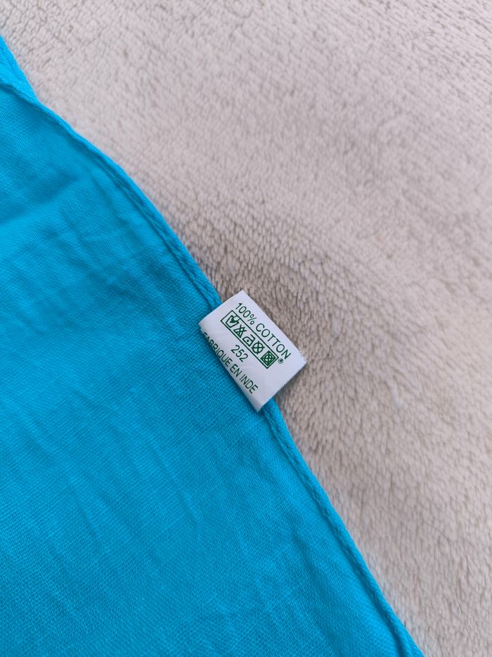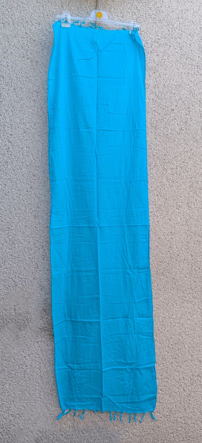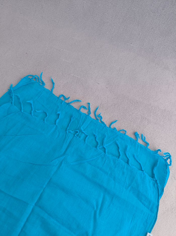 Foulard / Écharpe Marque Yves Rocher • Coloris bleu • Franges • Coton fin • Petits trous Longueur totale : 164 cm Largeur : 42 cm En bon état #evelyneaccessoires