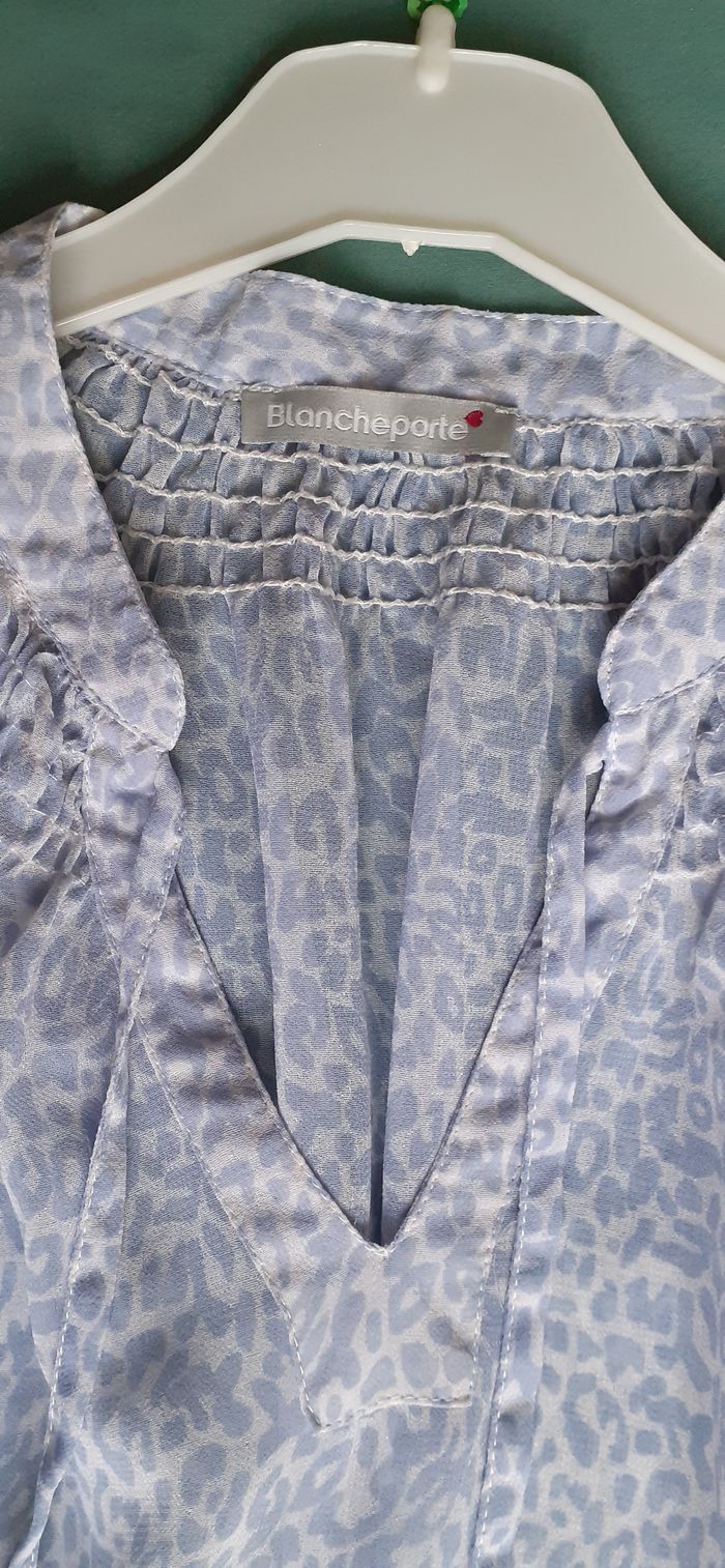 Vends une blouse en voile transparent, non doublée, 100 % polyester, manches 3/4 raglan, col en V avec liens, pan de derrière plus long et arrondi à la base, couleur blanc et bleu ciel, motifs léopard, marque Blancheporte, taille 44. Longueur dans le dos : 68 cm.
