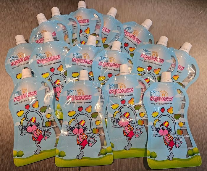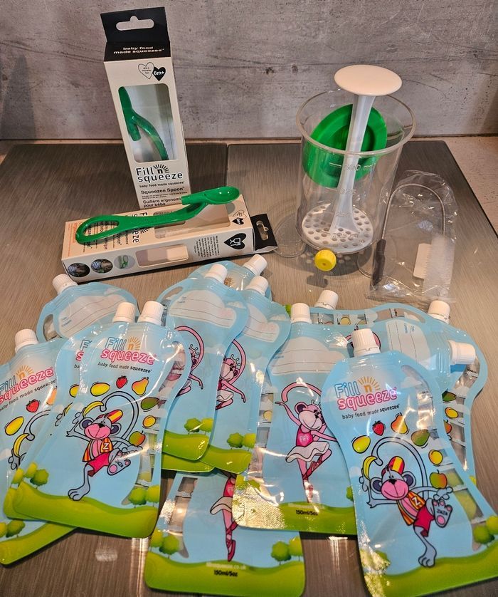 Kit de remplissage Fill Squeeze avec un lot de 15 gourdes rechargeables et 2 cuillères (servi 1 fois)
