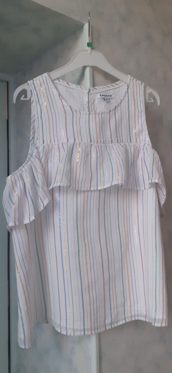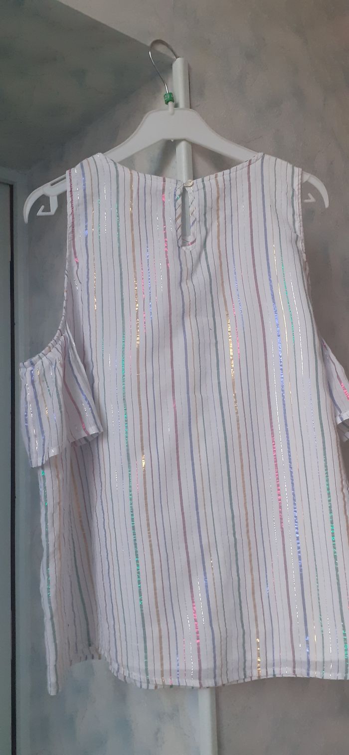 Vends un top sans manche en tissu très fin 93 % coton, 7 % métal, doublé, volant sur le buste et les emmanchures, couleur blanc avec fines rayures verticales multicolores brillantes, marque Creeks, taille 46. Longueur dans le dos : 60 cm Largeur aisselle à aisselle : 52 cm.