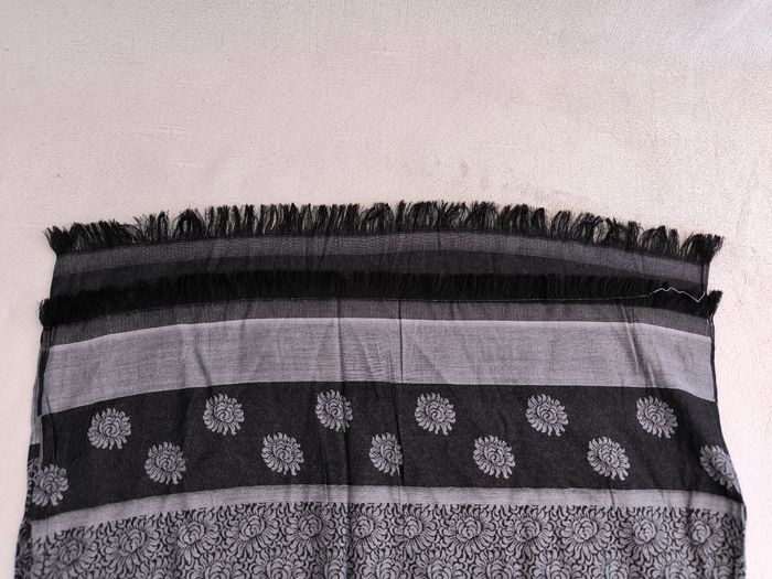 Foulard / Écharpe Marque • Coloris noir, gris • Imprimés fleurs • Franges • Tissu fin • Quelques fils de tirés, taches sur une extrémité Longueur totale : 177 cm Largeur : 55 cm En très bon état #evelyneaccessoires