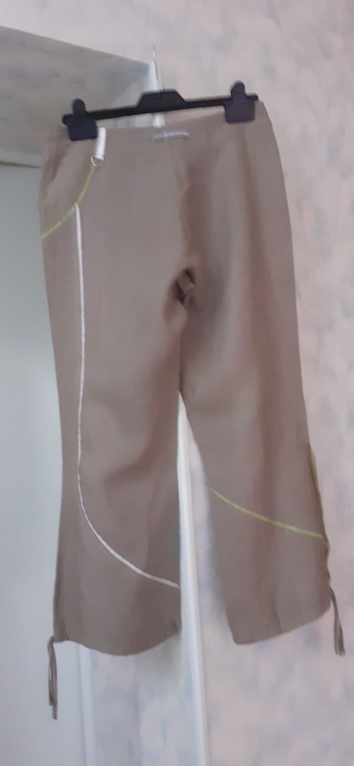 Vends un pantalon à pattes d'éléphant 92 % viscose, 8 % élasthanne, liens en bas des mollets, couleur kaki, marque La Mode est à Vous, taille 38. Longueur entrejambe : 61 cm. Largeur de la ceinture à plat : 35 cm.