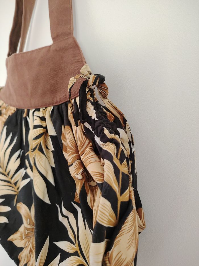 🛍️Sac à main en tissu avec motifs feuillages. 🎀Nouettes/nœuds de chaque côtés 🎀Fermeture bouton pression 🎀Une poche fermeture éclair à l'intérieur
