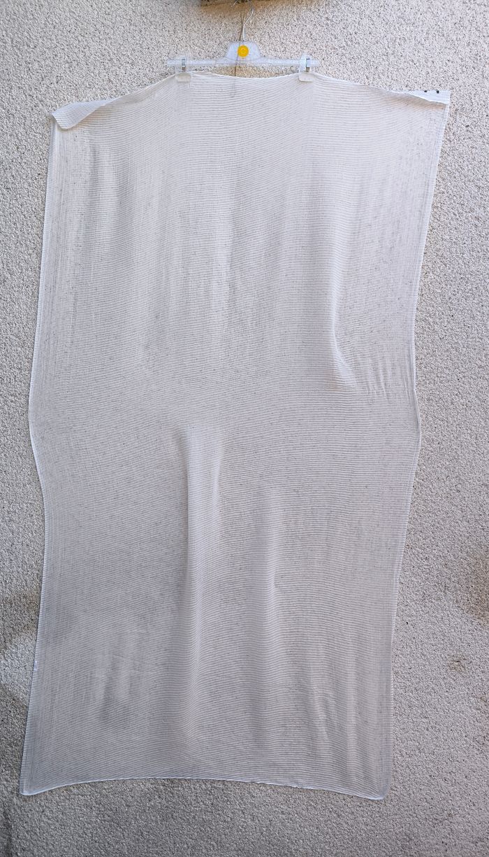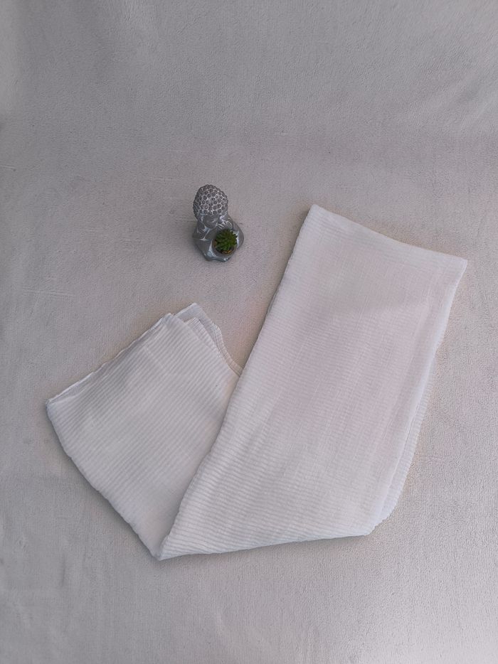 Foulard / Écharpe • Coloris blanc • Paillettes • Effet plissé • Tissu fin • Quelques fils de tirés/accros Longueur totale : 172 cm Largeur : 98 cm En très bon état #evelyneaccessoires