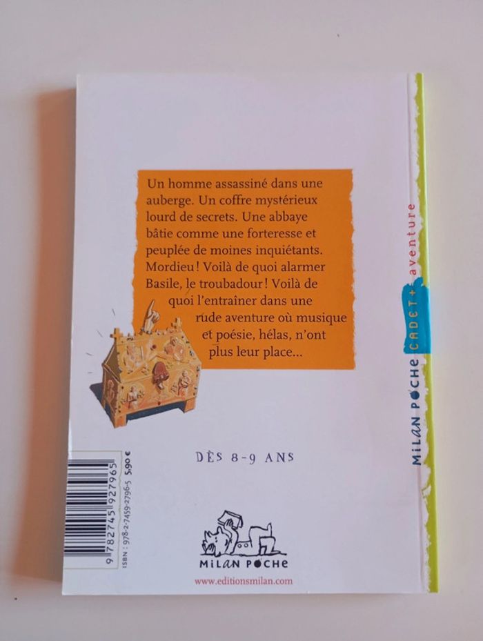 Un homme assassiné dans une auberge. Un coffre mystérieux lourd de secrets. Une abbaye bâtie comme une forteresse et peuplée de moines inquiétants. Mordieu ! Voilà de quoi alarmer Basile, le troubadour ! Voilà de quoi l'entraîner dans une rude aventure où musique et poésie, hélas, n'ont plus leur place... Éditeur ‏ : ‎ Milan Jeunesse 77 pages Âge de lecture ‏ : ‎ 6 - 8 ans Dimensions ‏ : ‎ 12.5 x 0.6 x 18 cm Livre en excellent état Je vends d'autres livres sur le Moyen-âge #phil_peg_moyenâge #abbaye #enquête #moyenage