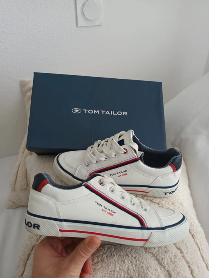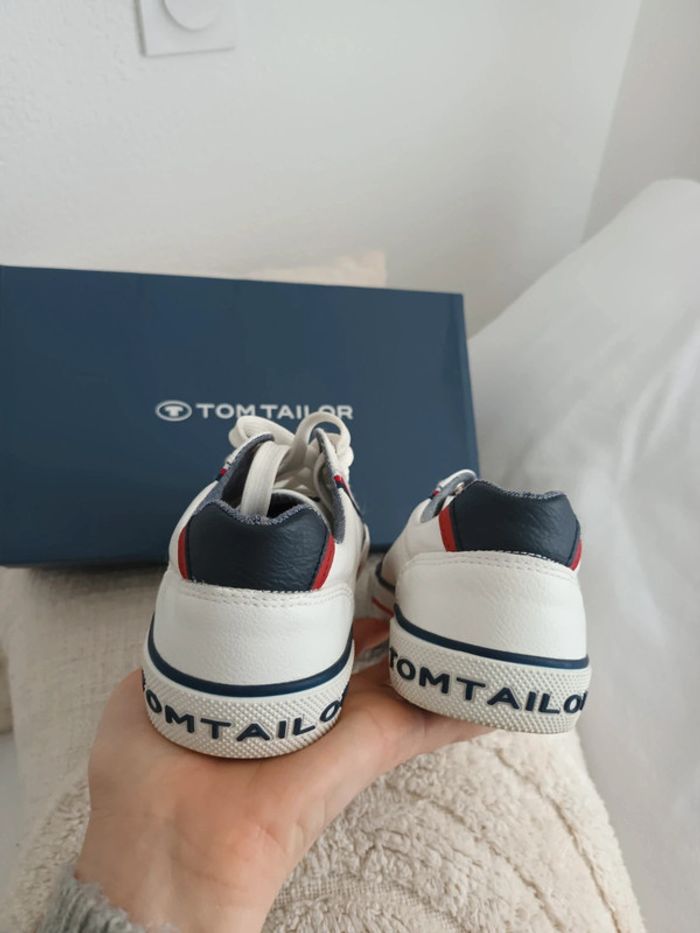 Jolie paire de baskets Tom Tailor pointure 33 Portées une seule fois Payées 59 € en boutique Coloris blanc, bleu marine & rouge