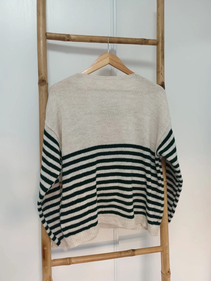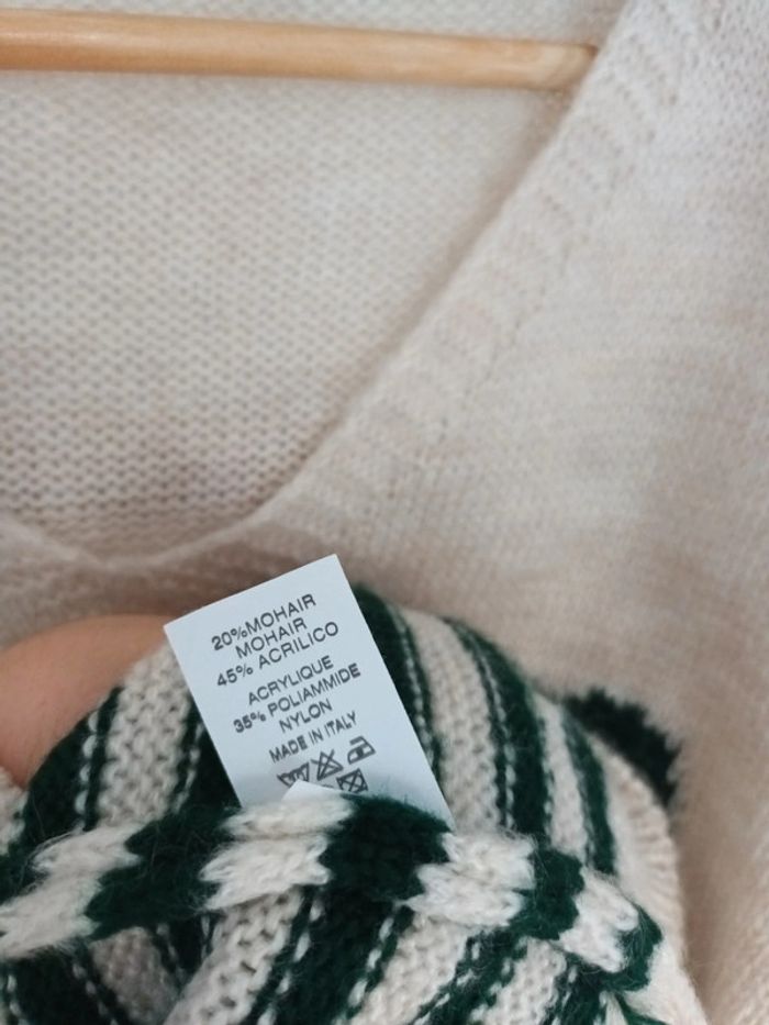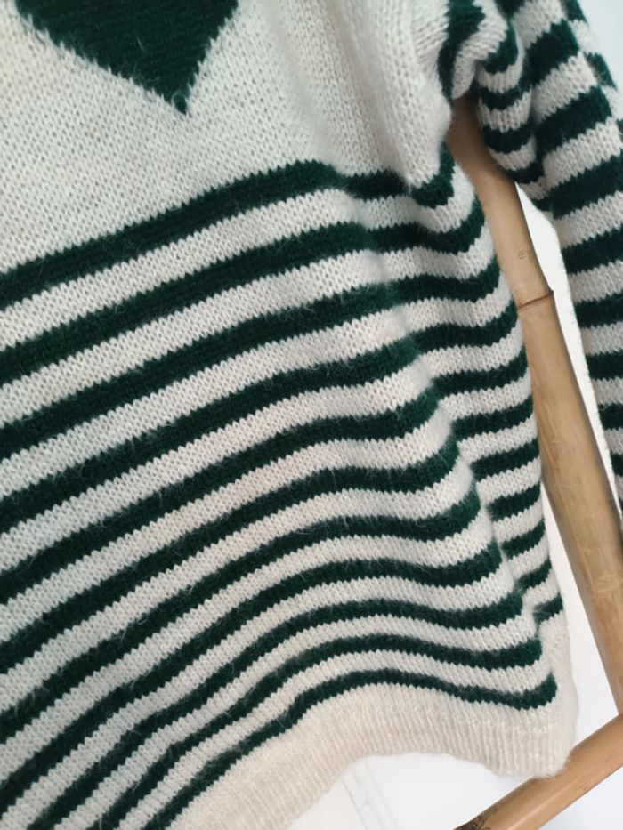 Joli pull col V marinière en mohair avec cœur Coloris beige crème & vert foncé En parfait état car porté une seule fois Composition visible en photo (20 % mohair)
