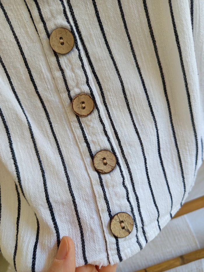 Petit haut rayé effet lin & boutons bois taille 38 qui convient plutôt à un 36 / 38