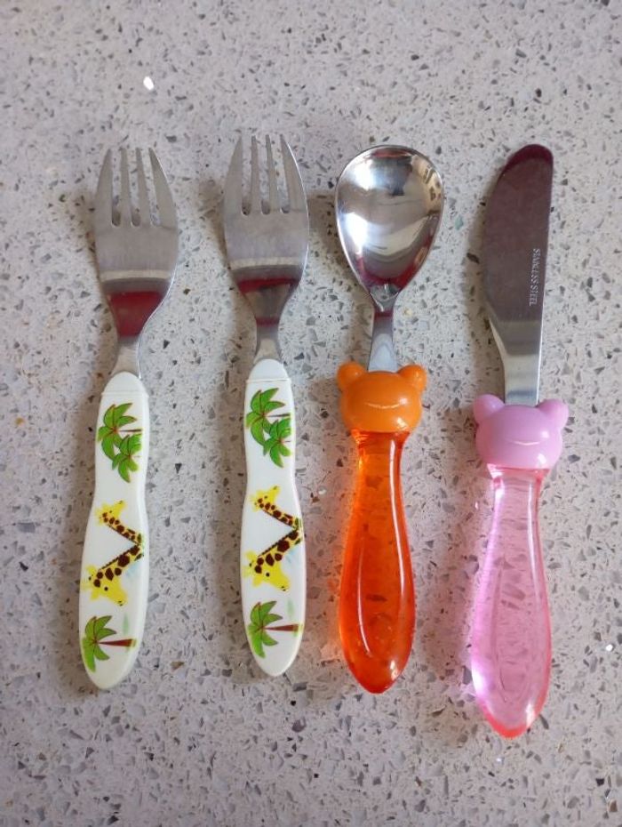 Lot de couverts pour bébé enfant Comprend 2 fourchettes 1 cuillère et un couteau La cuillère et le couteau sont neufs les 2 fourchettes st en très bon état Les manches sont en plastiques et le reste en acier inoxydable