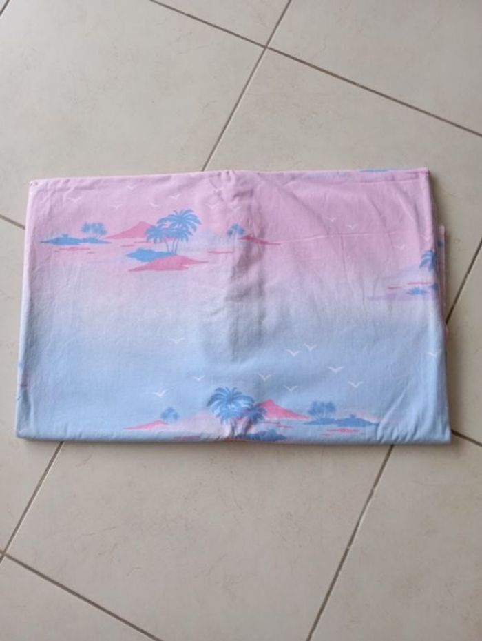 Drap plat 2 personnes neuf resté dans l'armoire Dimension 220x280 Couleur bleu et rose clair avec île palmier