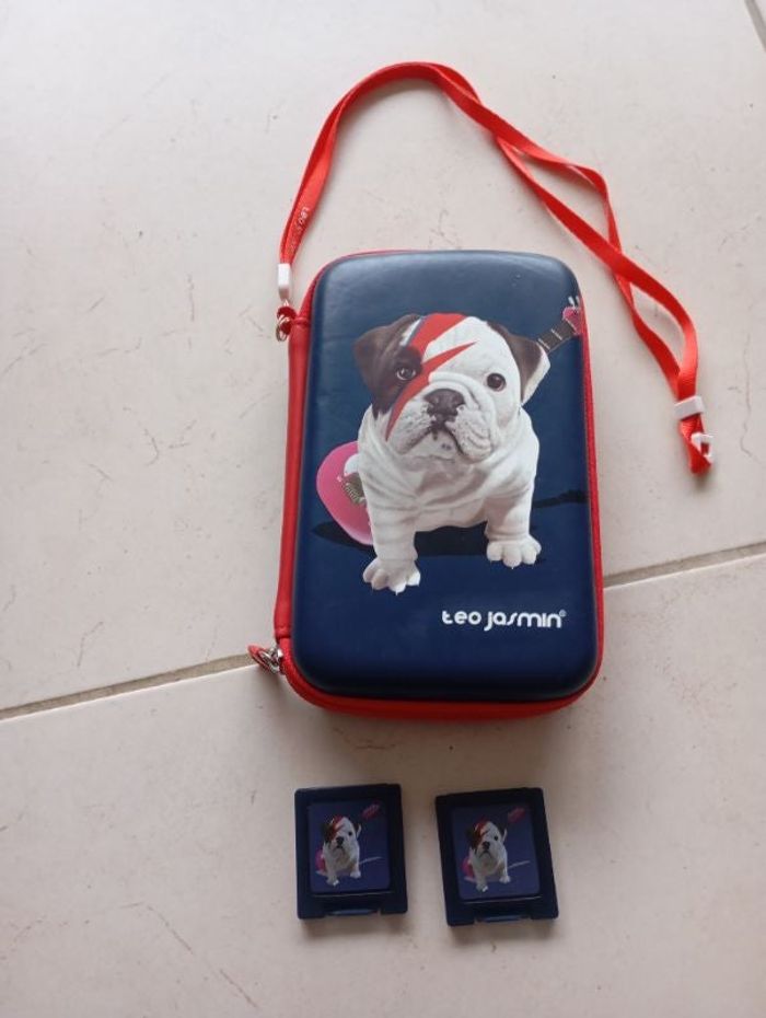 Pochette de rangement pour console portable Nintendo DS™Lite/DSi™/3DS™/New 3DS™ Pochette rigide fermeture zip rouge sinon bleu marine avec un bouledog avec dragonne très bon état Deux bandes élastique permettent de maintenir la console Nintendo 3DS™ Espace de rangement pouvant contenir 3 jeux 2 boîtes sont comprises et 3 stylets supplémentaires non compris