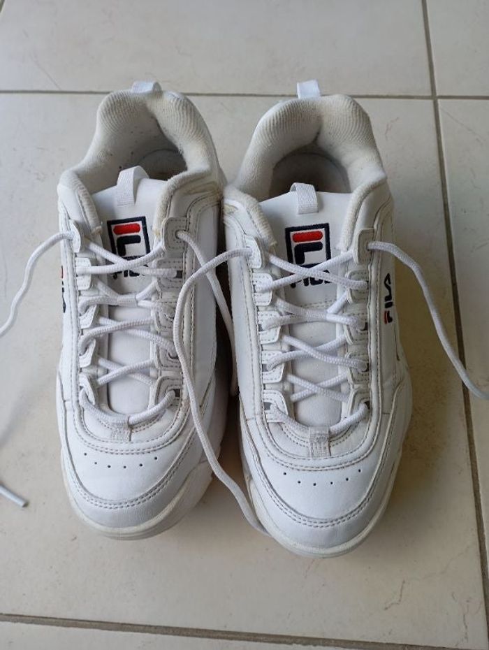 Taille 39 Très bon état sauf sur les côtés intérieurs des pieds un peu d'usure voir photo Apportez une énergie rétro à votre rotation avec ces baskets Disruptor de Fila. Dans un coloris blanc frais, ces chaussures ont une tige en cuir synthétique lisse pour une tenue durable. Elles sont dotées d'une fermeture à lacets ton sur ton avec un rembourrage épais autour de la cheville pour un ajustement parfait, et reposent sur une semelle intercalaire en mousse épaisse avec un amorti doux sous le pied. Une semelle extérieure en caoutchouc audacieuse et dentelée vous maintient en place.