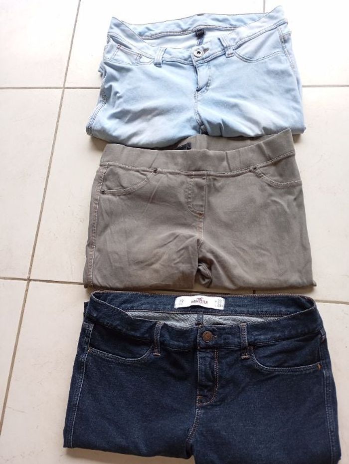 Lot de 3 jeans stretch qd on tire sur le tissus il est élastique taille 38 Un kaki Jennyfer kaki très bon état mais un peu passé à des endroits il n'a pas de fermeture éclair ni de bouton à la taille Un bleu clair Pimkie très bon état Un bleu foncé Hollister très bon état sauf sur les fesses le tissus fait des petits points blancs voir photo