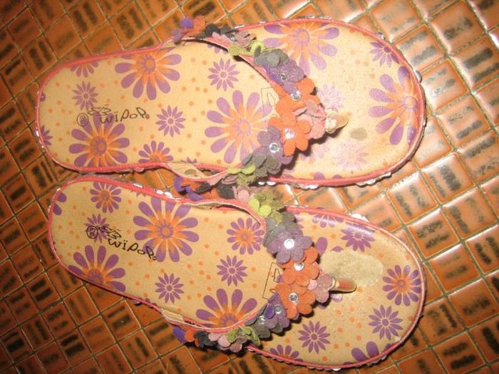 jolie tong à fleurs taille 33 les fleurs sont en très bonnes états, juste la semelle dessus manque dessins fleurs violette est tte marron à un endroit au niveau gros orteil voir photo pas en mousse solide