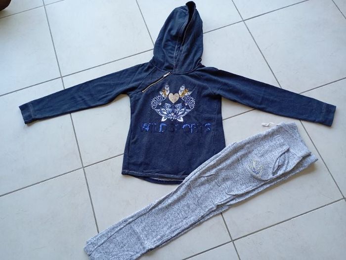 Ensemble sport comprenant un pantalon avec cordon intérieur et un gilet zippé avec poches en très bon état comme neuf sur les tons violet
