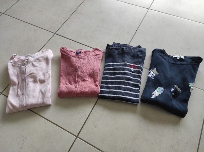Lot de 4 articles 2 gilets Un vieux rose ( 2eme) avec point doré 12 ans Kiabi Un Rose clair bordure avec fils argenté 13-14 ans tex Et 2 pulls Un pull marin 12 ans Kiabi Un pull bleu marine avec sequins 11-12 ans tex Les 4 sont en très bon état le gilet rose clair est neuf