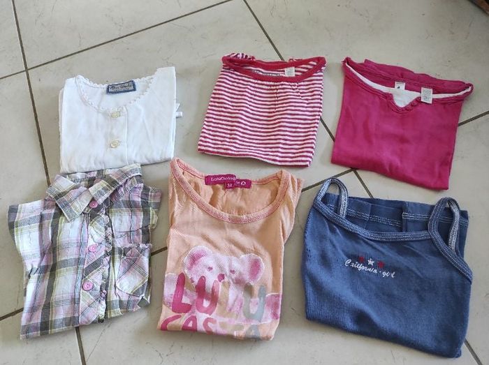 1 tt blanc 2 Okaïdi un rayé et un rose avec des poissons coeur ds le dos 1 chemise longboard multicolore 1 débardeur lulu castagnette ton pêche 1 tee shirt ttes petites bretelles bleu Tous en très bon état