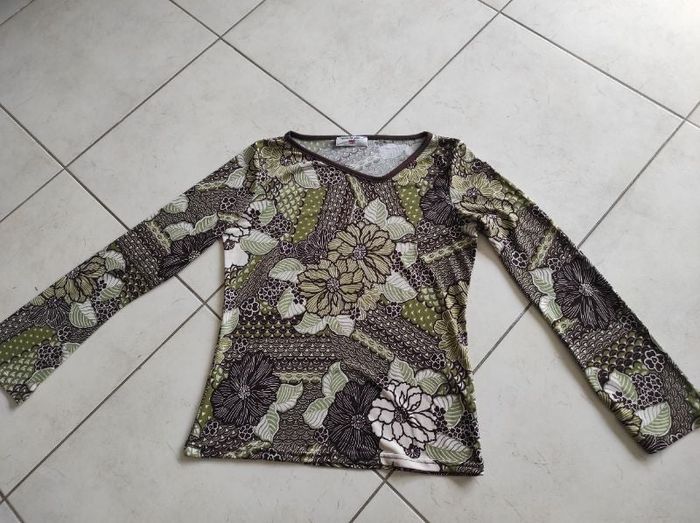 Jolie tee shirt manches longues taille 3 sur les tons marrons vert et beige neuf jamais mis Marque après la pluie