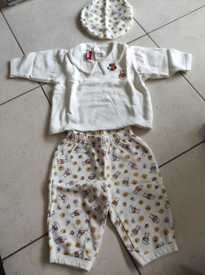 Ensemble 3 articles comprenant un pantalon un sweat avec col claudine un béret Ton jaune très clair avec dessin abeilles et oursons Ils st tous les 3 très chaud car moletonnés Très bon état