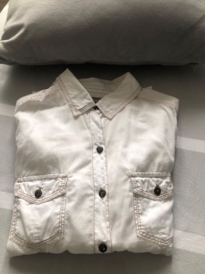 Chemise blanche manches longues Couture surpiqué coloris taupe Les manches se replient et peuvent être attachées par un bouton ( voir photo) Bas arrondi Très bon état Longueur 60 cm Largeur épaules 36 cm