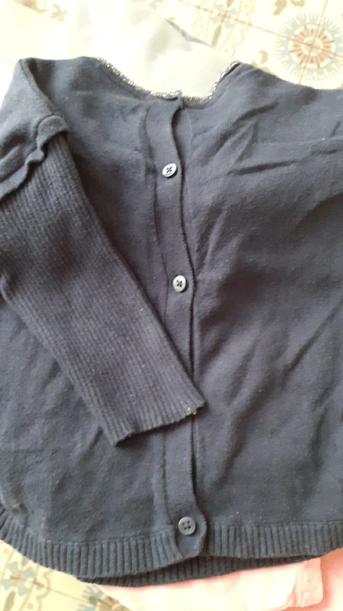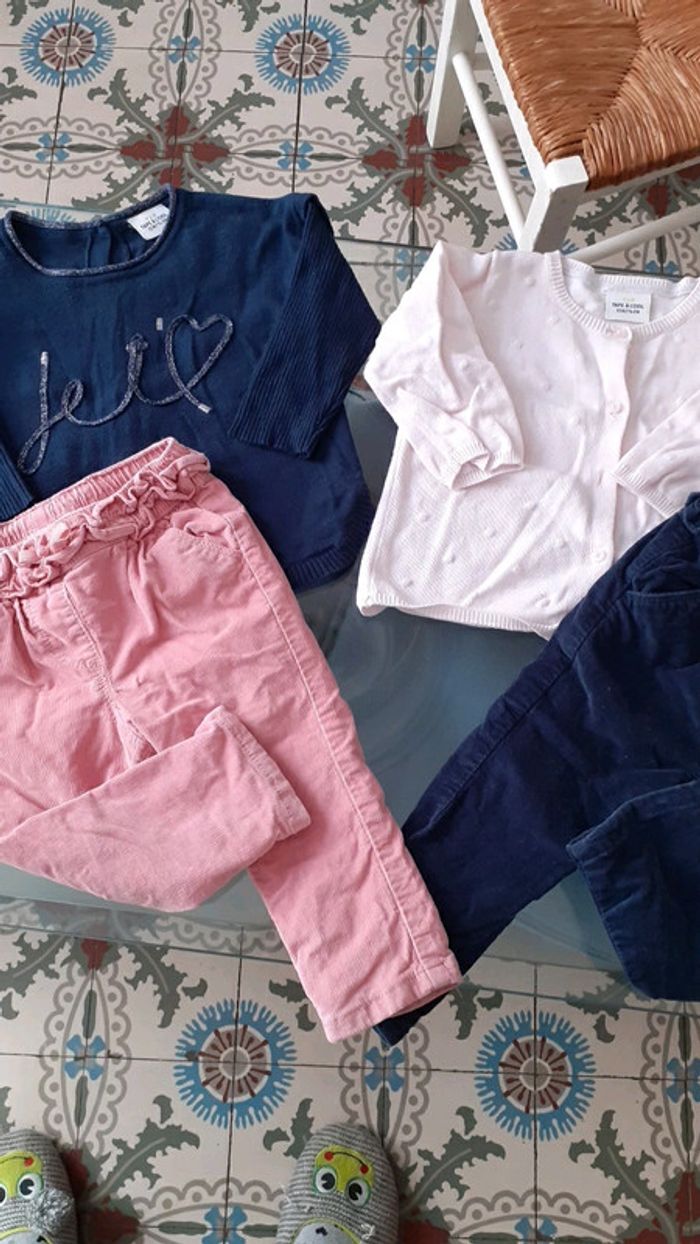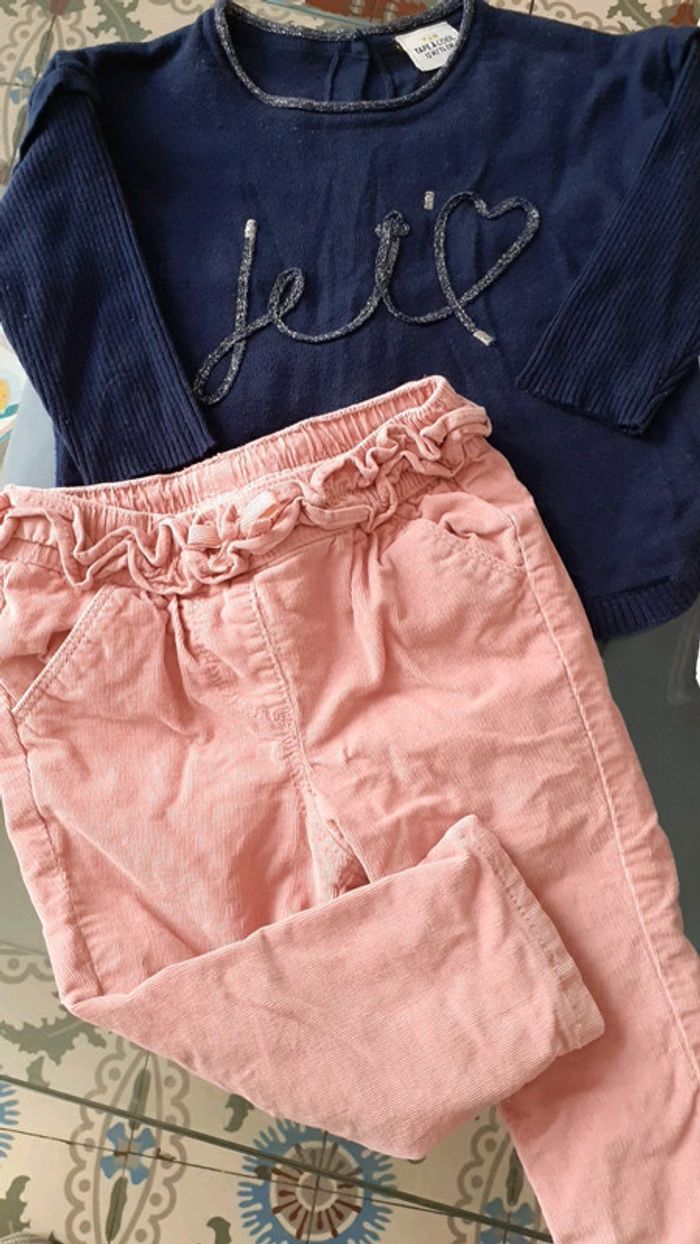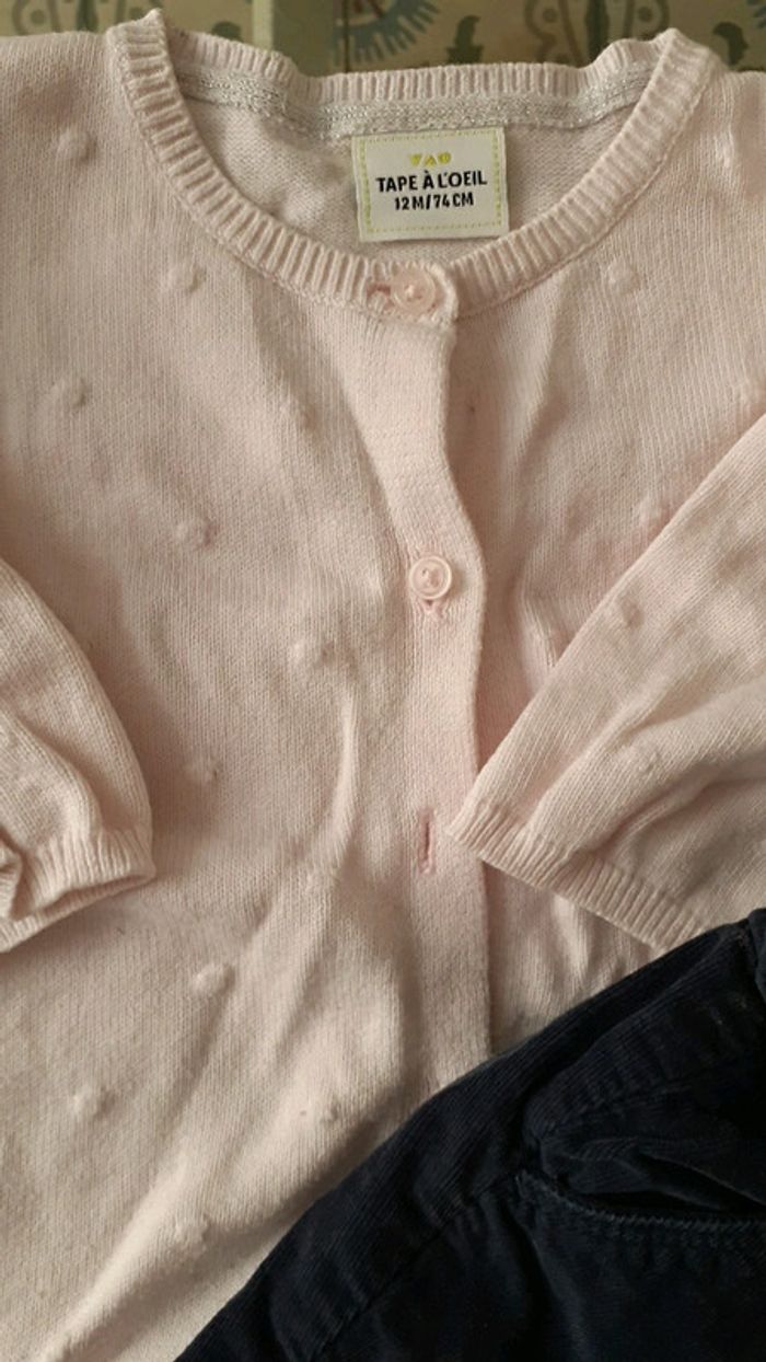 2 pantalons en velours rose et bleu marine 1 pull bleu marine avec bouton dans le dos et 1 gilet rose pâle #vachenou12mois