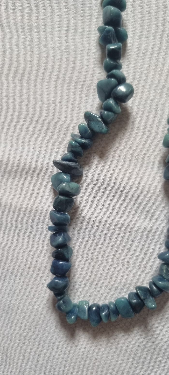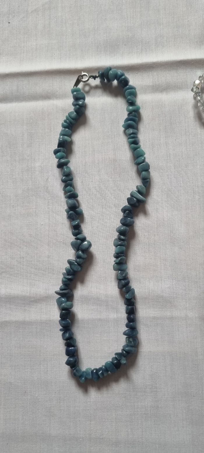 Lot de 2 colliers 1 en pierres bleues et 1 en perles (plastique) Bon état Je n'ai pas su quoi mettre dans "taille" j'ai mis au hasard