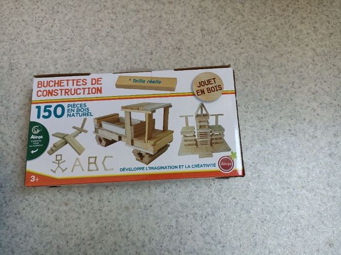 Boîte de 150 bûchettes en bois naturel permettent de construire, écrire, dessiner Dimensions voir sur la boîte Neuve