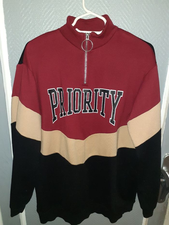 Très beau pull, inscription : PRIORITY. Molletonné à l'intérieur. Couleur : Bordeaux, noir, beige. Fermeture impeccable. Petite bouloche, mais rien de méchant. #femmefab59