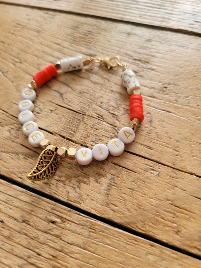 Bracelet en perles Heishi ⭐ DOLCE VITA ⭐ Fermoir et pampille feuille 🌿