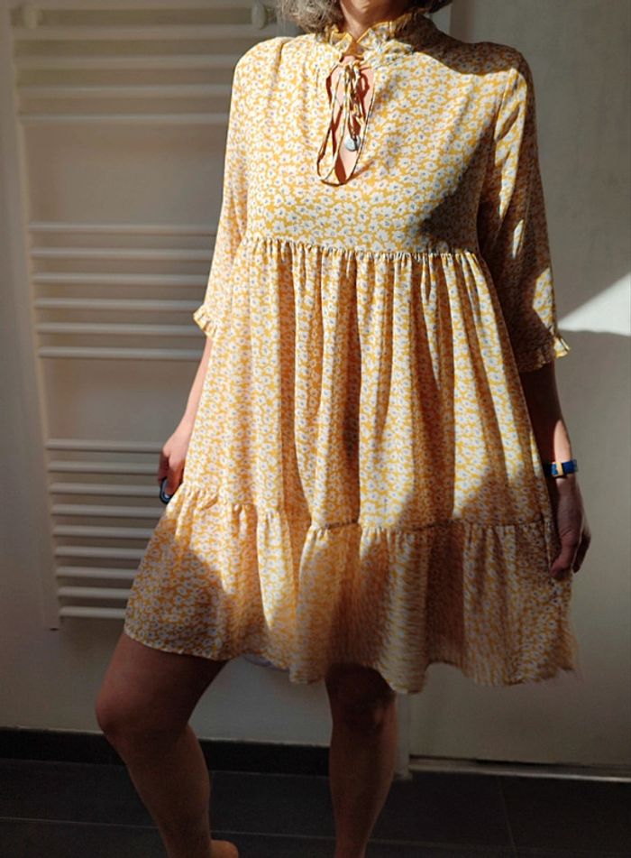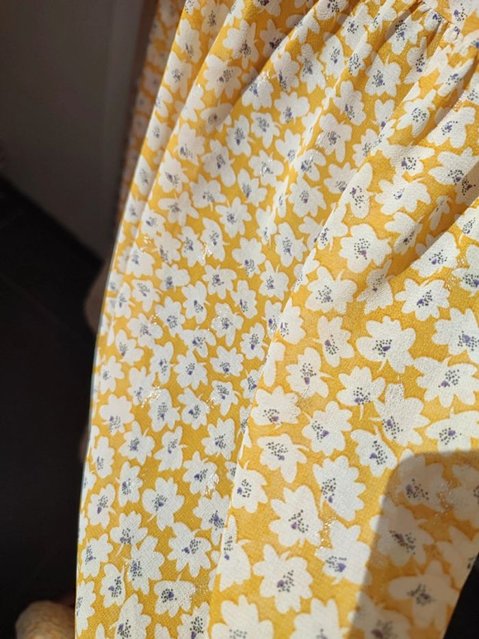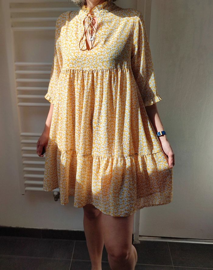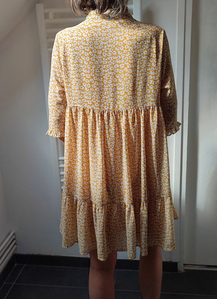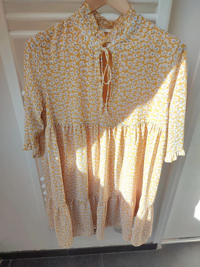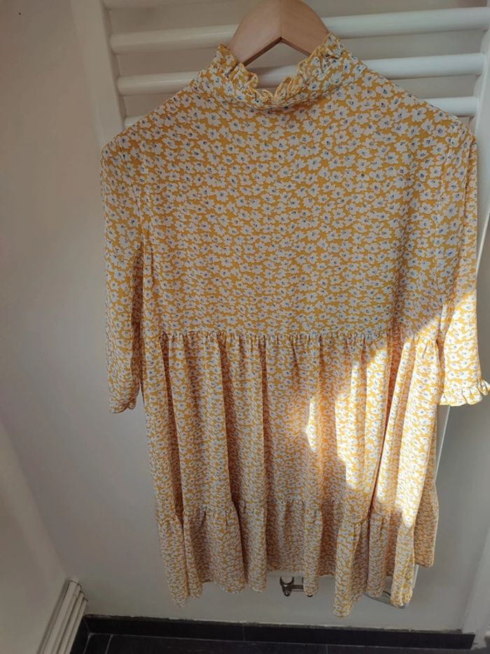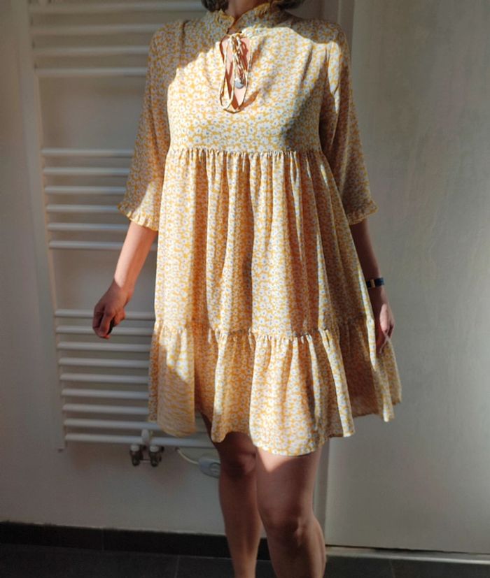 #iansolofemmetaille40 Magnifique robe imprimé fleuri forme babydoll et petits points brillants dorés col montant ajouré sur le devant avec une fermeture et un cordon . Coloris a dominante jaune moutarde Doublée excellent état