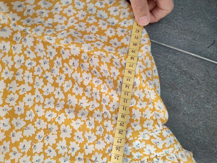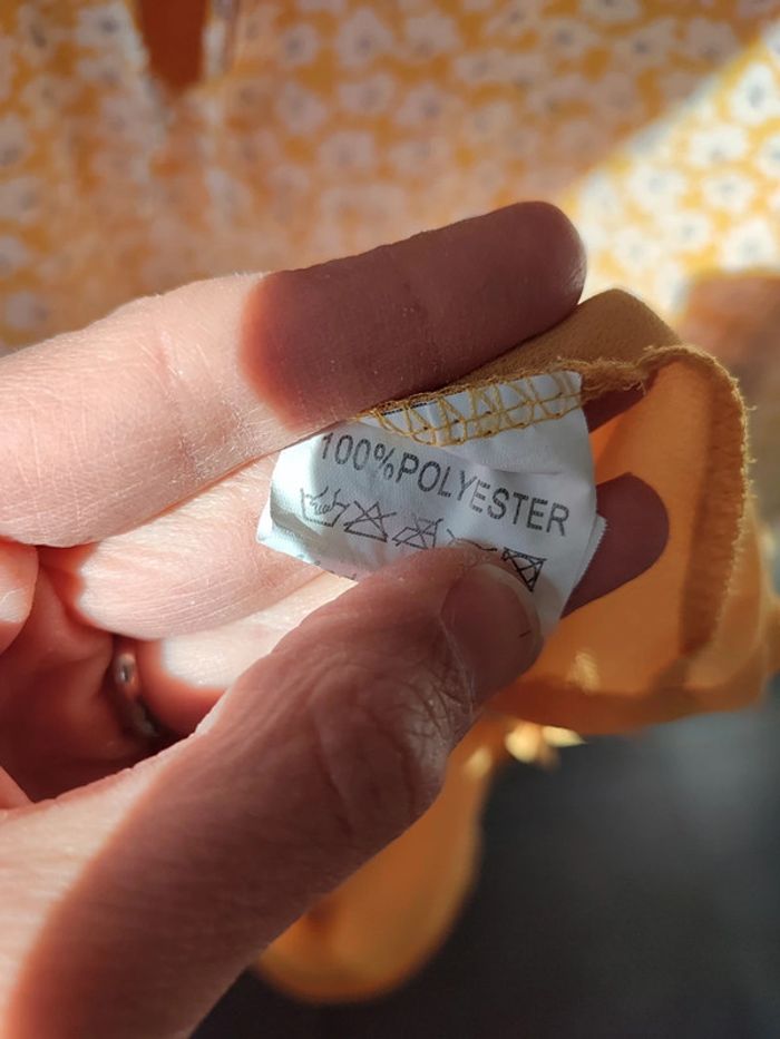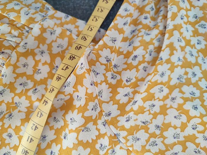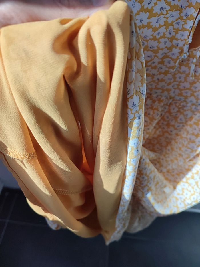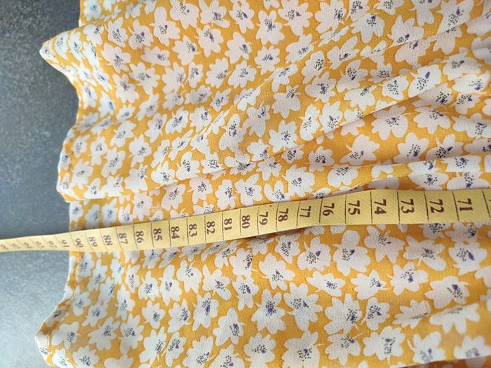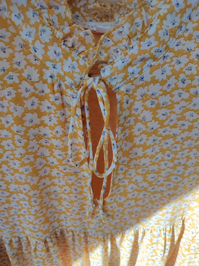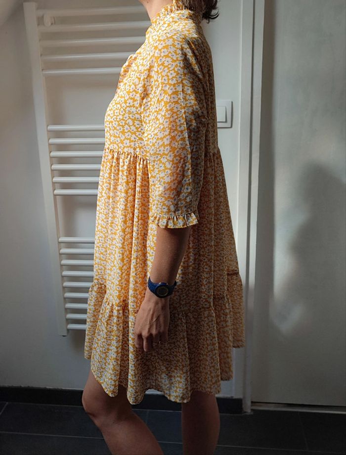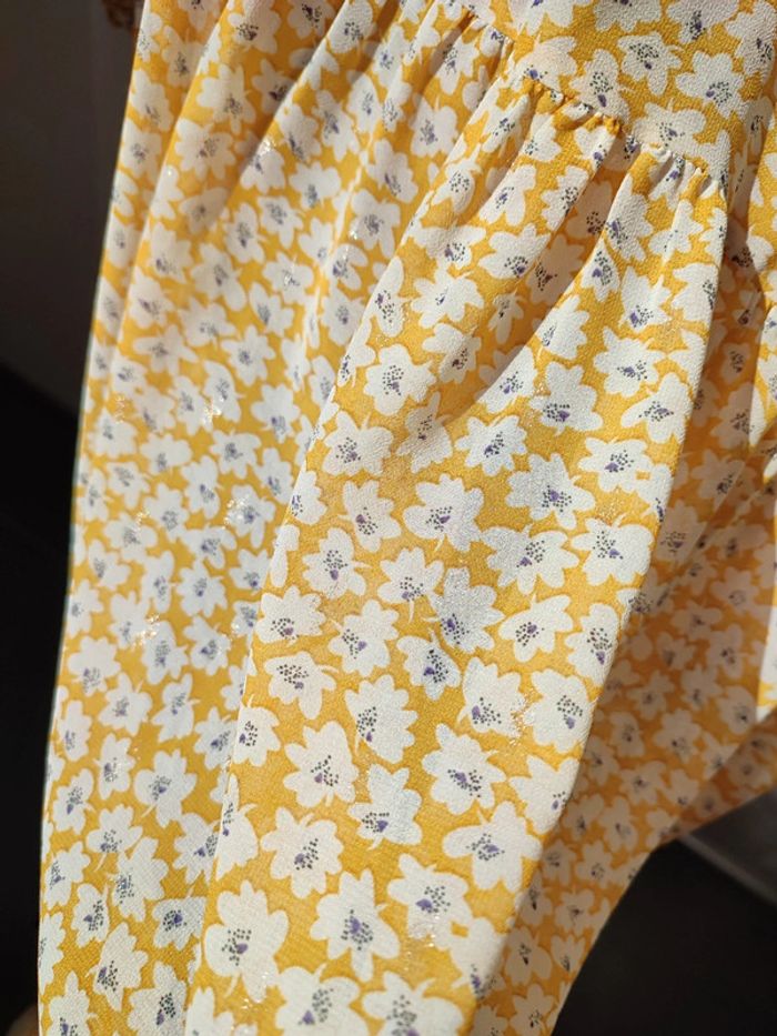 #iansolofemmetaille40 Magnifique robe imprimé fleuri forme babydoll et petits points brillants dorés col montant ajouré sur le devant avec une fermeture et un cordon . Coloris a dominante jaune moutarde Doublée excellent état