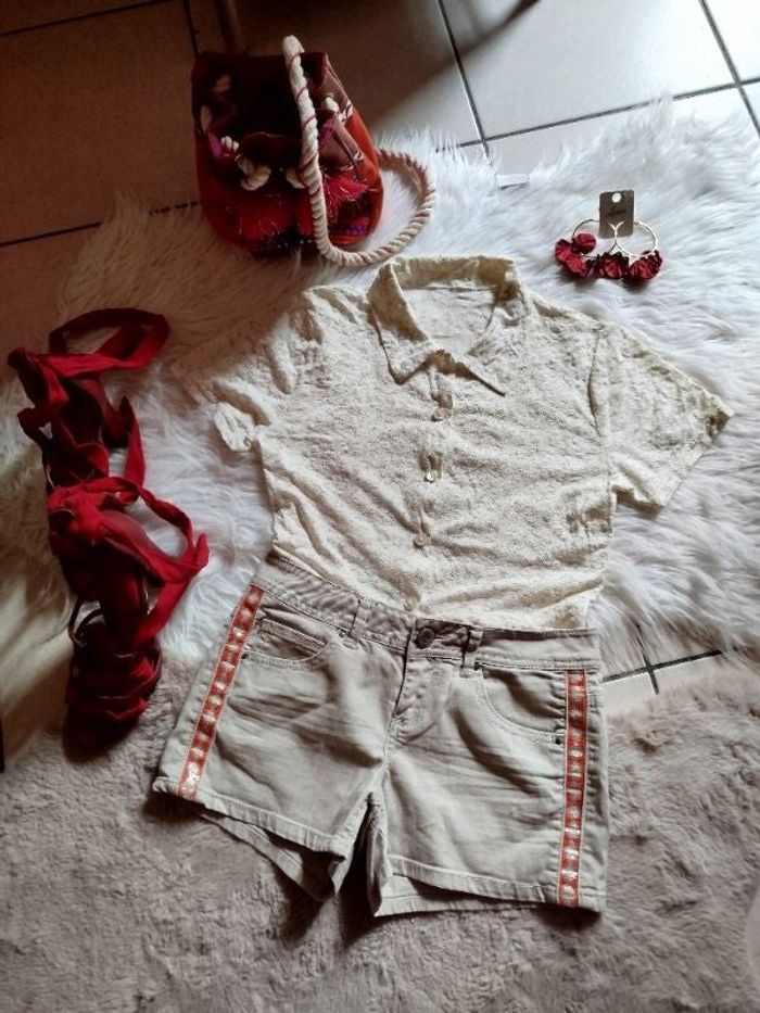 Bonjour - 40 % sur mon dressing familiale et amicale toute l'année. Peu porté en excellent état. Magnifique petit short avec bande sequin de chez PROMOD. Coton elasthane. Taille à plat 37 cm. Taille entrejambe 20 cm. Longueur 29 cm. Peu également convenir à M . Possédant d'autres n'hésitez pas à me suivre. Ouverte à toute discussion raisonnable. Activation sur les lots à partir du 2eme articles. Blouse également en vente dans mon dressing.