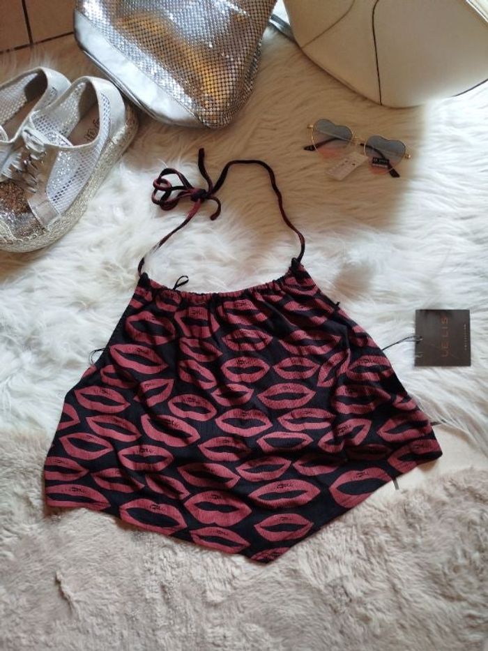Bonjour - 40 % sur mon dressing familiale et amicale toute l'année. Magnifique croc top se noue dans le dos motif lèvre. Acheter et jamais porté. Longueur 40 cm. Il est magnifique. Super élastique 7% de spandex équivalent Elasthane. Possédant d'autres haut n'hésitez pas à me suivre. Ouverte à toute discussion raisonnable. Activation sur les lots à partir du 2eme articles