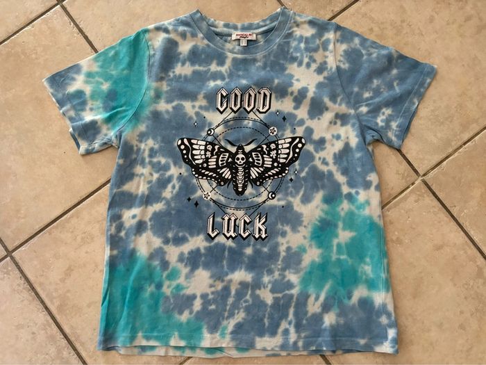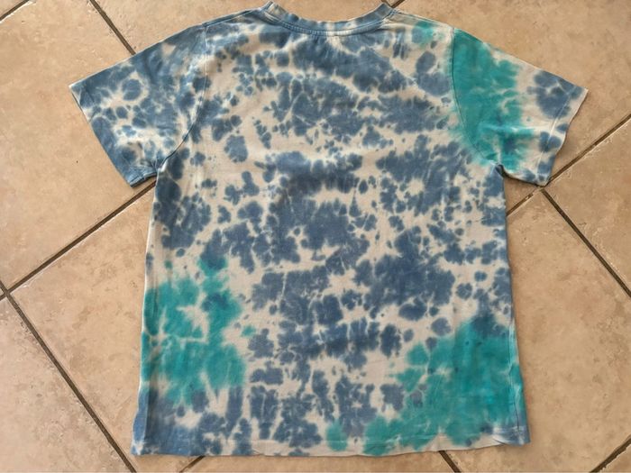 Manches courtes. Bleu délavé motif poitrine. 2 petits défauts visible sur photo 3
