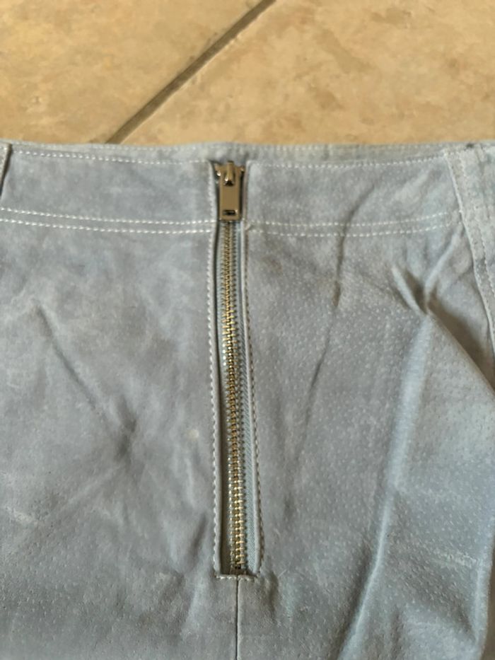 Bleu clair. Zip au dos, boutons blancs décoratifs sur les hanches. Doublure polyester