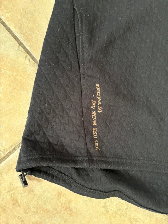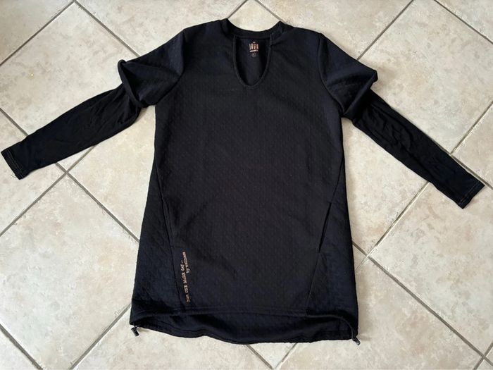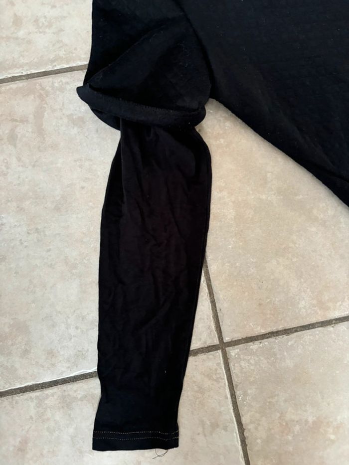 Colors noir. Tissu aspect légèrement matelassé. Effet superposition d’un tee shirt noir manches longues. Qqs petits détails dorés cuivrés . Noté taille S mais peut convenir à 36 petit 38. Lien de serrage en bas