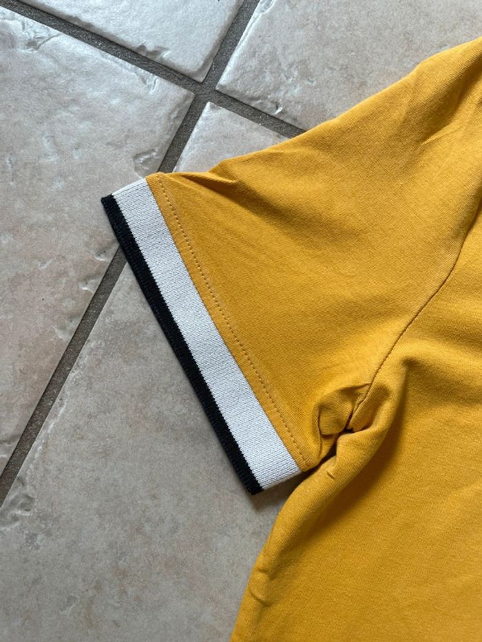 Manches courtes coloris moutarde. Bandes blanche et noire au bout des manches