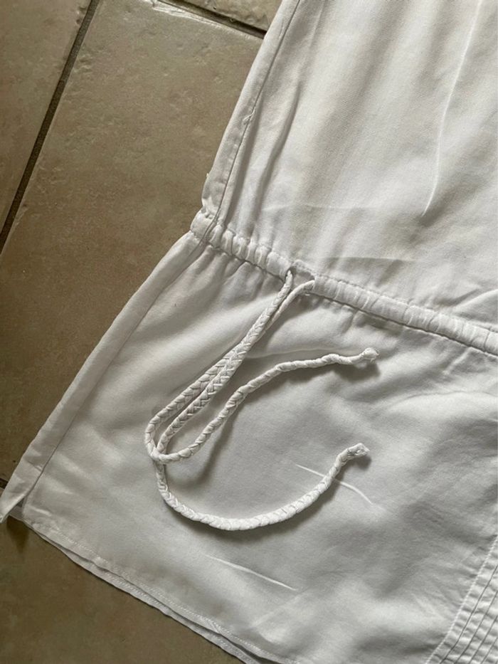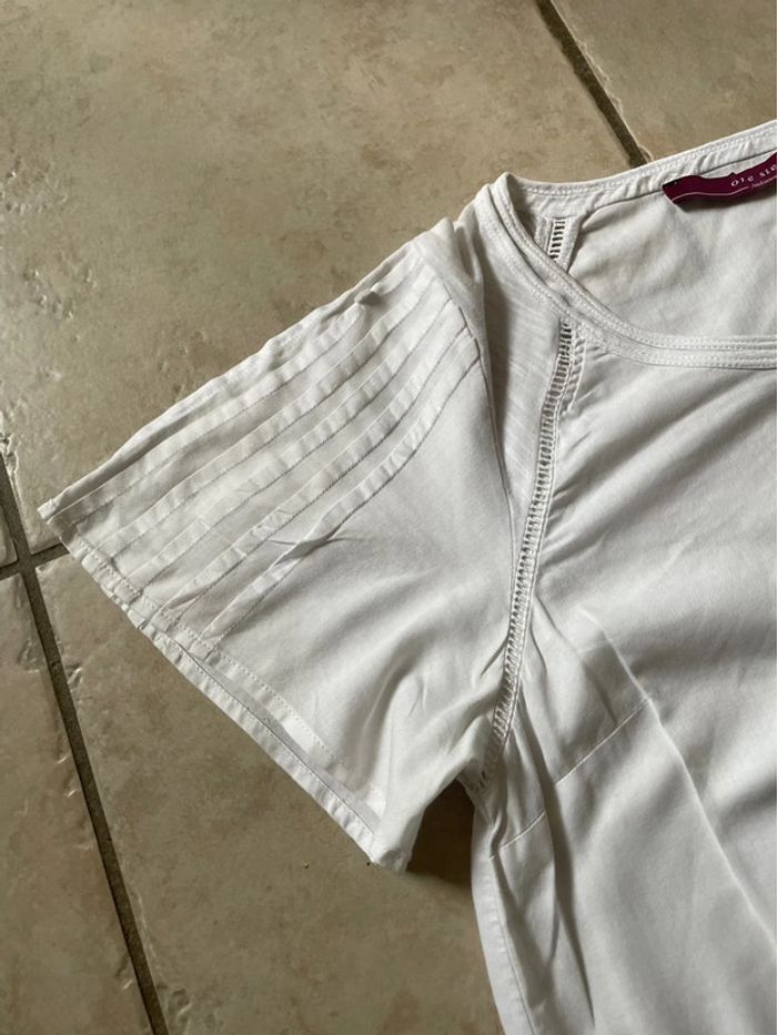Manches courtes, coloris blanc. À nouer sur le côté. Plein de petits détails ton sur ton