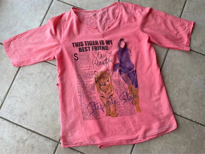 abricot motif devant. très légère idéale pour plage, piscine. manches 3/4. passants cotés pour y mettre une ceinture fine ( non fournie )