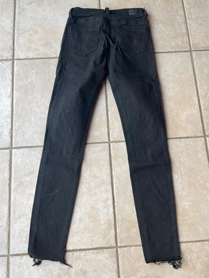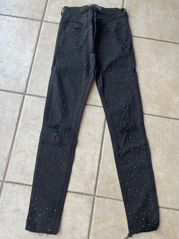 Noir avec strass argent. Déchire aux genoux . Manque qqs strass mais ne se voit pas porté