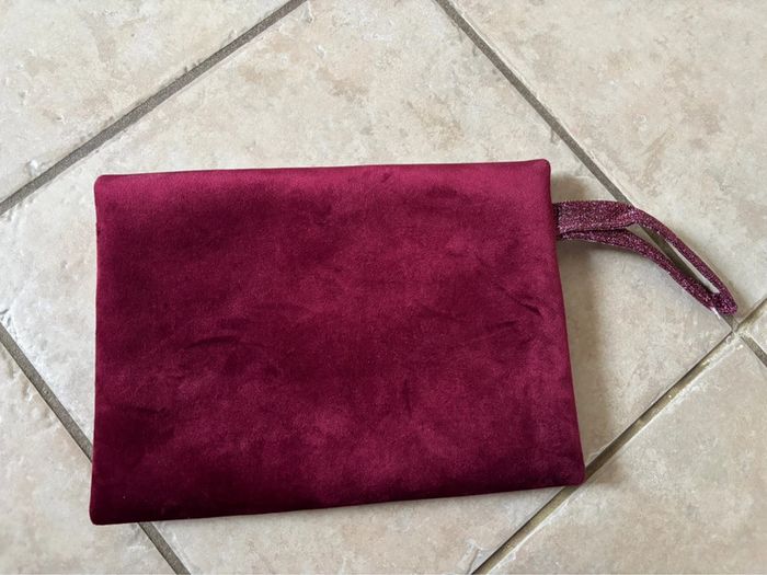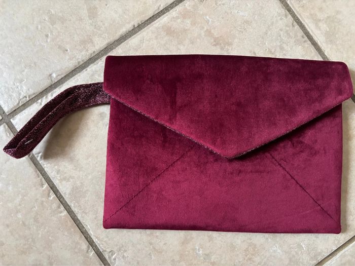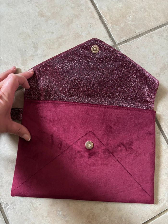 Colors bordeaux en velours. Lanière pailletée, comme le revers du rabat. Dimensions 26x 19 cm Neuve
