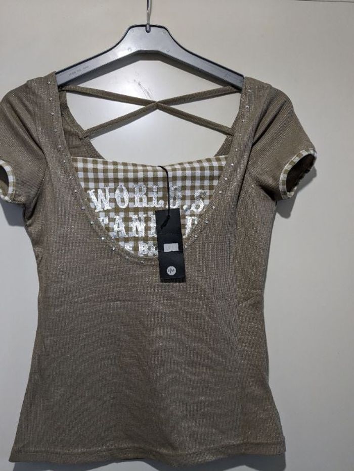 Très beau tee shirt beige irisé et strass et joliment décoré.