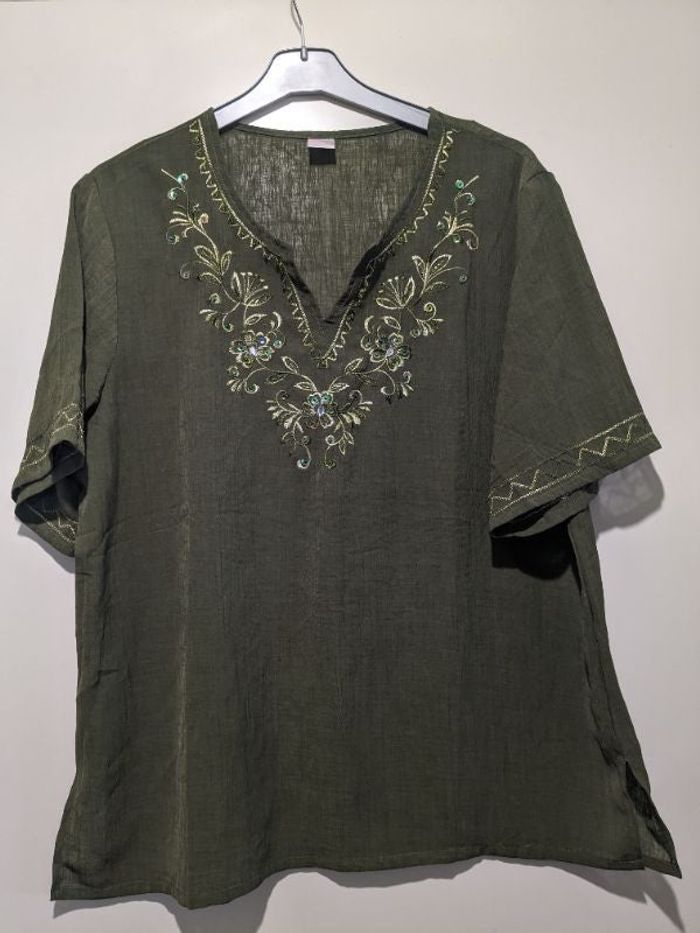 Magnifique blouse, tunique joliment décorée avec broderie au fil brillant et sequins tout autour de l'encolure . Fentes latérales pour plus d'aisance.