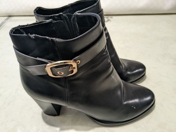 Très jolie paire de bottines souples et confortables. Elles font un joli pied ! Portées une fois et rangées depuis ! Quelques éclats sur bordures peut-être au contact des autres chaussures et un point sur un côté ? Voir dernières photos
