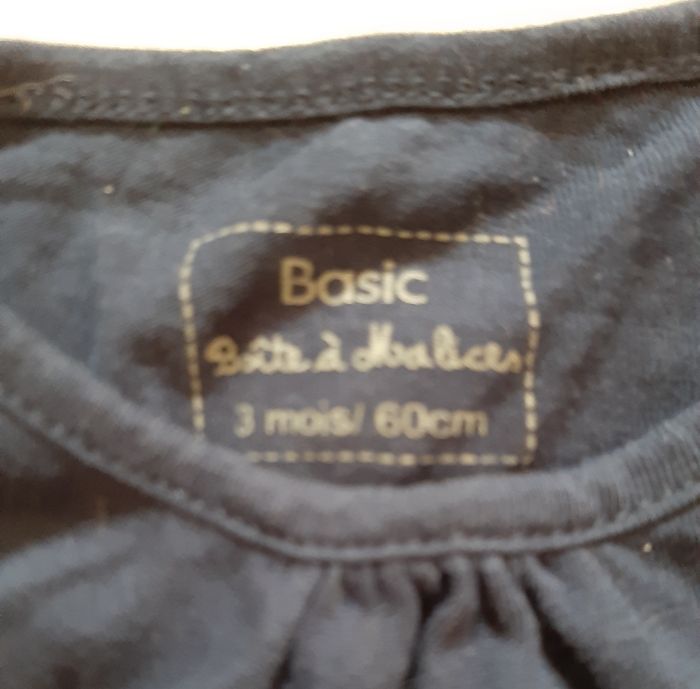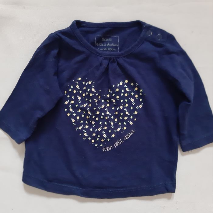 tee-shirt à manches longues bleu marine, de la marque Boîte à Malices, en taille 3 mois 2 boutons pressions sur l'épaule pour faciliter l'enfilage motifs : fleurs disposées en forme de cœur inscription : Mon petit cœur En très bon état.